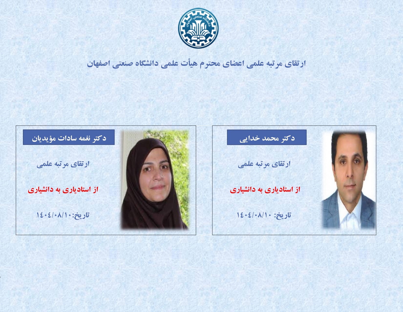 1- آقاي دكتر محمد خدائي - عضو محترم هيأت علمي دانشكده فني و مهندسي گلپايگان - ارتقاي علمي از استادياري به دانشياري