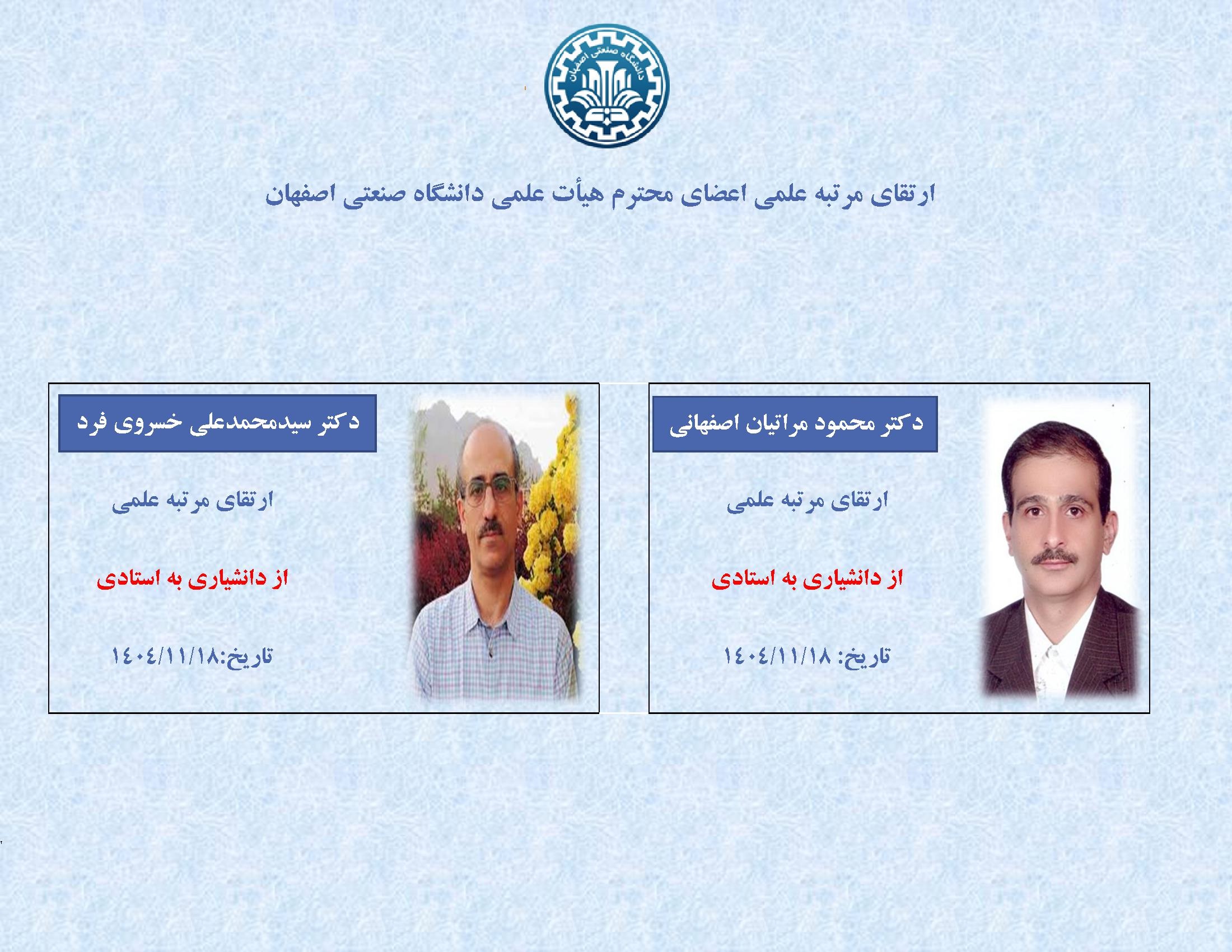 1- جناب آقاي دكتر محمود مراتيان اصفهاني - عضو محترم هيأت علمي دانشكده مهندسي مواد - ارتقاء رتبه علمي به استادي